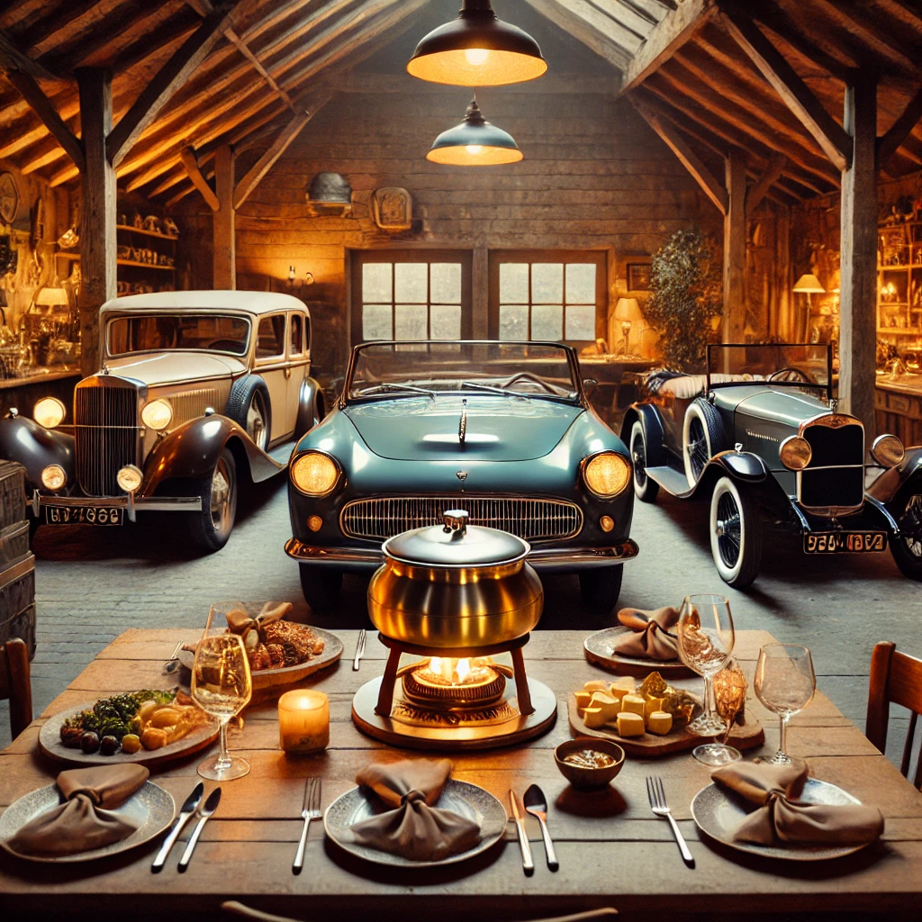 DALL·E 2024 10 09 07.49.45 A cozy scene of a fondue dinner set between vintage Oldtimers in a rustic charming garage like setting. The warm golden light from the fondue pot ill