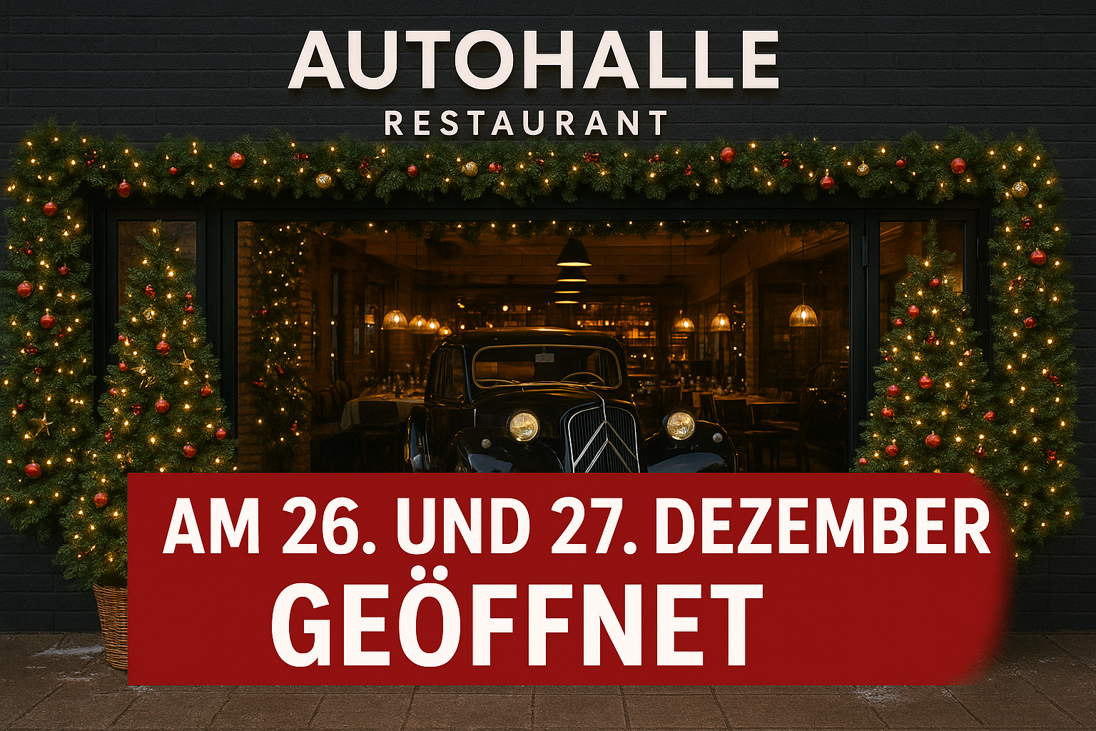 Autohalle Andelfingen Hostbachstrasse 4, Andelfingen, SchweizLiebe Freunde der Autohalle Am 26. & 27. Dezember begrüssen wir euch herzlich zu unseren besonderen Weihnachtsöffnungszeiten: Öffnungszeiten 26.12: 11:45 – 23:00 Uhr ¦ Warme Küche: 11:45 - 13:30 Uhr und 18:00 - 20:45 Uhr Öffnungszeiten 26.12: 11:45 – 23:00 Uhr ¦ Warme Küche: 18:00 - 20:45 Uhr Entdeckt hier unser festliches Weihnachtsmenü und freut […]